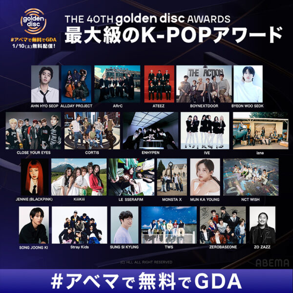 新しい未来のテレビ「ABEMA(アベマ)」は、2026年1月10日(土)の夜6時30分より、最大級のK-POPアワード『第40回 ゴールデンディスクアワード』を日韓同時・国内独占無料生中継します。また、レッドカーペットの様子は午後4時50分より無料生中継します。