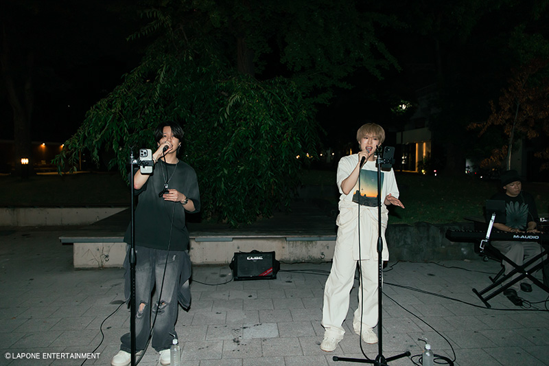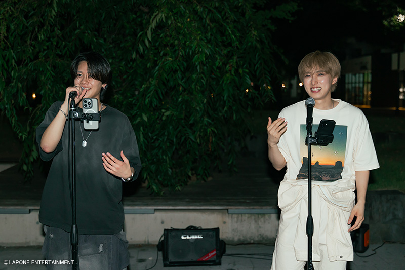 尾崎・藤牧は8月4日(月)にオリジナル楽曲「Unrequited Love(アンリクワイテッド ラブ)」「プロポーズ」の2曲をデジタルリリース。当日、千葉と仙台で路上ライブを実施するという思わぬサプライズで話題を呼んでいました。終了後、Instagramの生配信で藤牧は「自分的には修行だと思っている」「まだまだもっと歌がうまくなりたい」と意欲を見せ、尾崎は「初心に戻れて楽しい」と率直な感想をコメント。その後も不定期で路上ライブを開催し、オリジナル楽曲のほかINIの楽曲やカバー曲など、各地で精いっぱい歌を届けてきました。