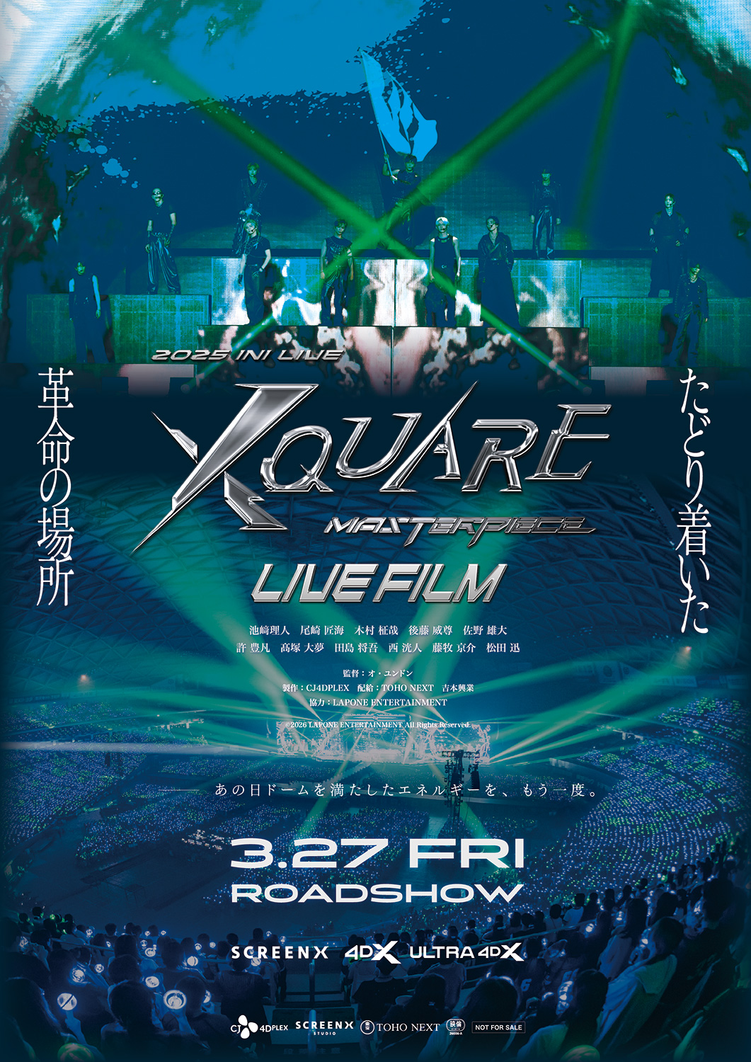 本作は、昨年9月に3日間にわたり、愛知・バンテリンドーム ナゴヤにて開催した「2025 INI LIVE[XQUARE – MASTERPIECE] 」のライブ映像を映画化した作品で、通常版のほか、SCREENX、4DX、ULTRA 4DXの各種ラージフォーマットでも同時公開が決定しています。