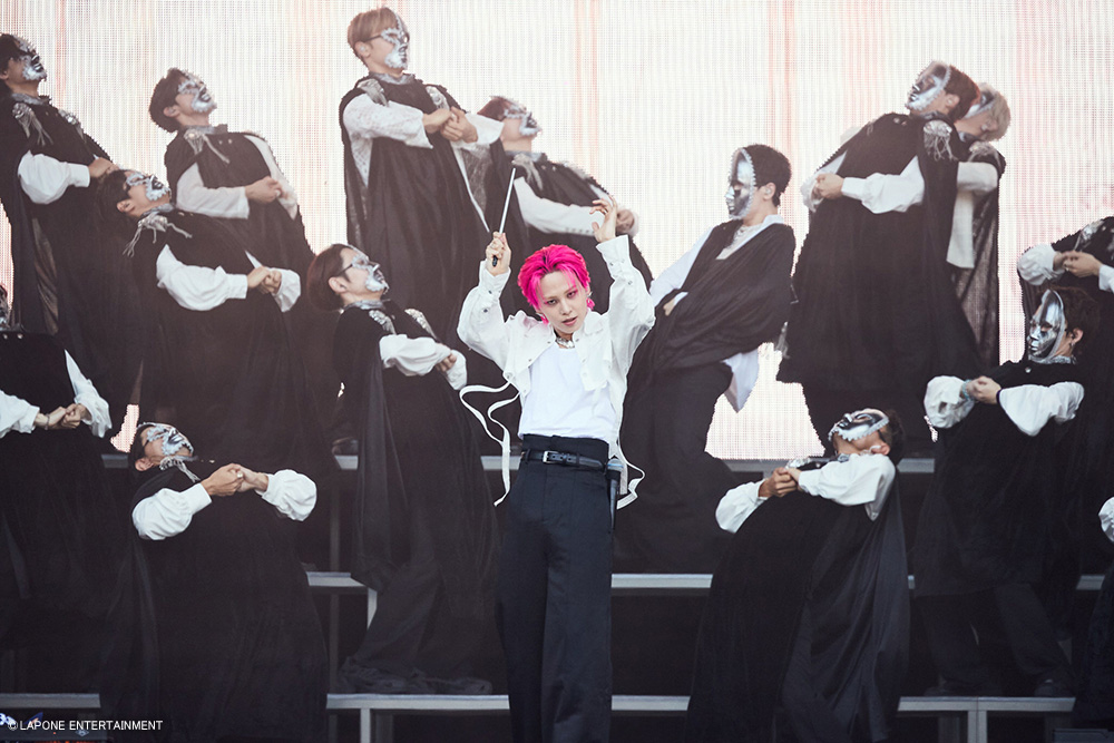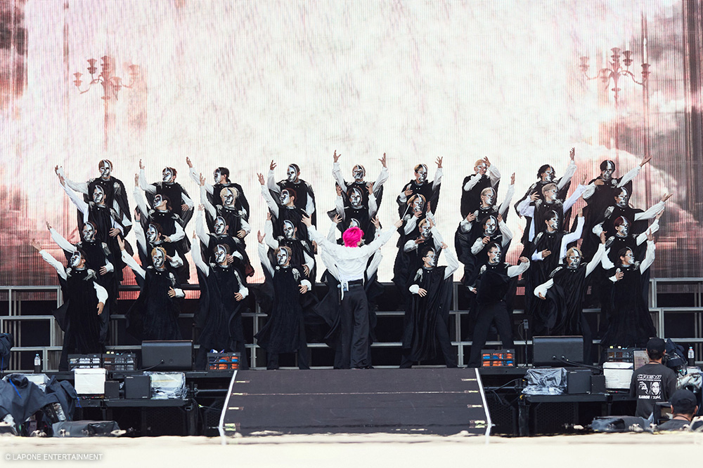 『SUMMER SONIC 2025』東京公演のメインステージ「MARINE STAGE」。この日トップバッターを飾ったMrs.GREEN APPLEが作り上げた熱気をそのまま受け取るように、JO1の出番がやってきます。ステージに指揮棒を携えた川尻蓮が登場。川尻の合図に合わせ、黒いマントと仮面をつけたダンサーたちが設置されたひな壇ステージに次々と現れます。30名以上のダイナミックな群舞でショーが幕を開けると、観客の期待感は一気に膨れ上がっていきます。そこへロングヒット中の「BE CLASSIC」のイントロが流れ出し、歌い始めの瞬間、ダンサーの中からマントと仮面を外した豆原一成が姿を現すと、大歓声が巻き起こります。ダンサーに紛れていたメンバーが続々と顔を見せ、ひな壇ステージを駆使した特別なフォーメーションで、目まぐるしく展開していきます。