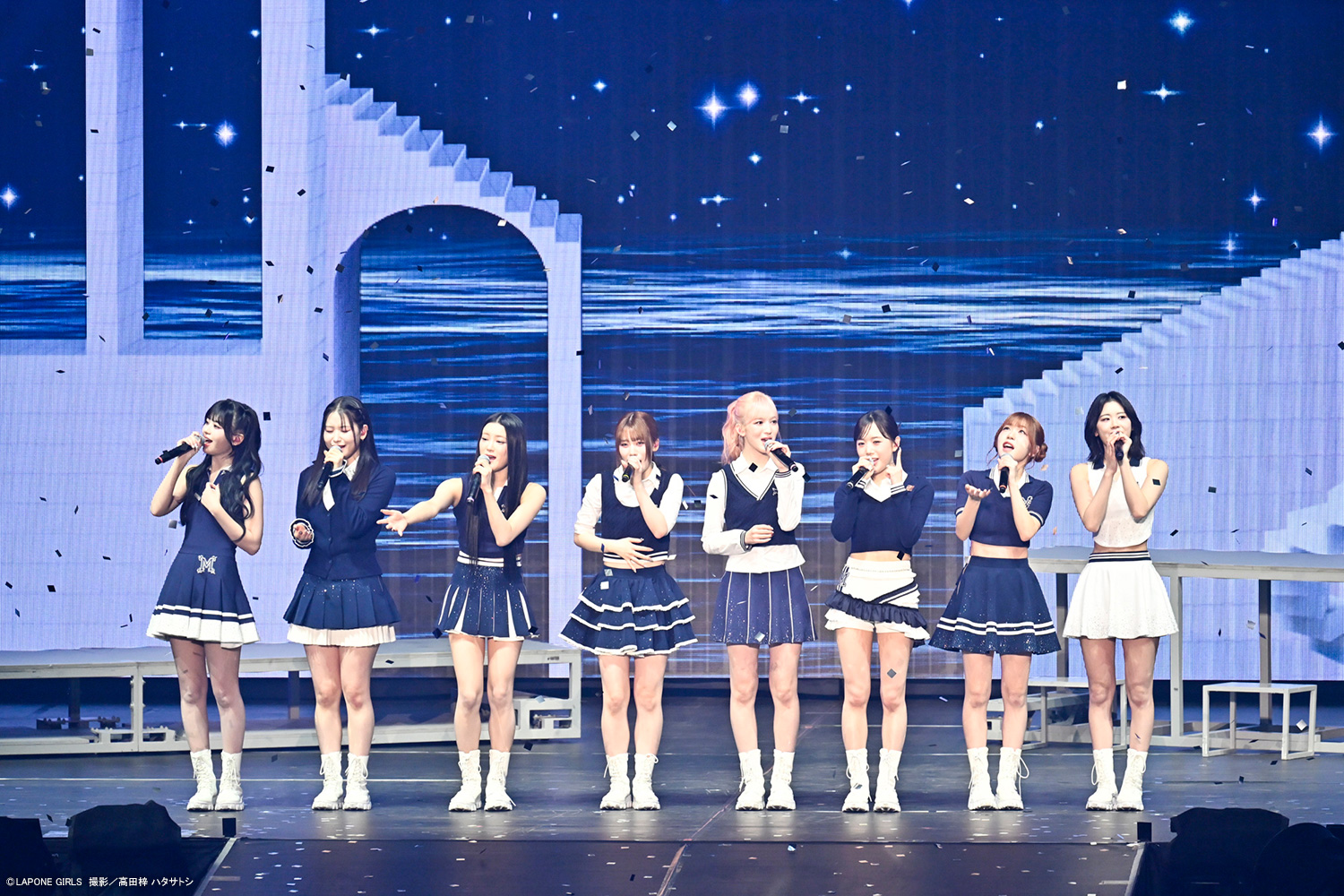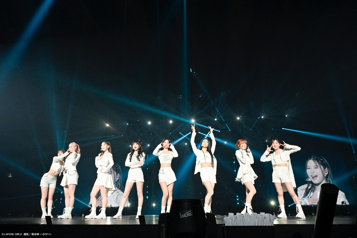 オープニングは、カラフルなカラーレーザーから星空が輝くような美しい演出から、ME:Iのメンバーがメインステージに横一列に並んで登場。真っ白な衣装のメンバーがひとりずつポージングをキメるインパクトのある登場に、会場は割れんばかりの歓声に包まれた。