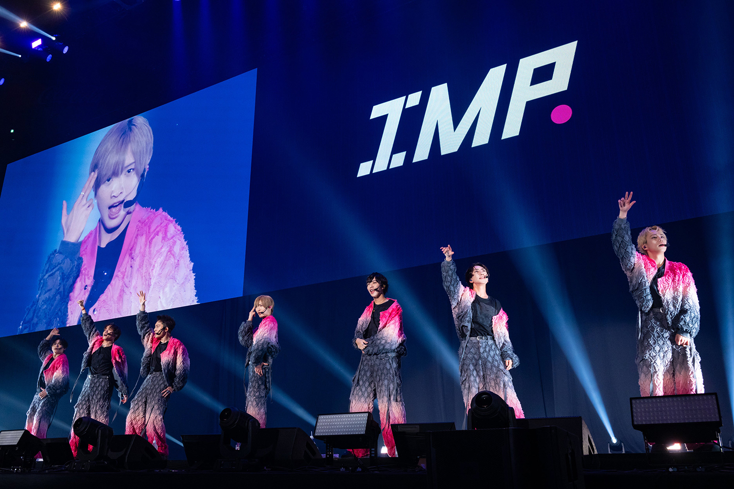 グループカラーである黒とピンクの衣装でそろえたIMP.のステージは、佐藤新の「ついてこい、ROCKIN’ PARTYだ!」という勇ましい叫びでスタート。「Go Higher」では観客が四つ打ちに乗せてジャンプして、場内はさながらダンスホールのような雰囲気に包まれる。一気に3曲を畳み掛けたあとは、はつらつとしたムードで1人ずつ自己紹介。基俊介は「こんなふうにグループの垣根を越えて盛り上がれることはなかなかないよね」と、イベントの独特な雰囲気を噛み締める。そして後半は切ない心情が描かれた新曲「Reckless Love」、彼らの原点といえるデビュー曲「CRUISIN’」、パワフルなダンスナンバー「BAM-BOO」など、バラエティ豊かなセットリストが展開された。