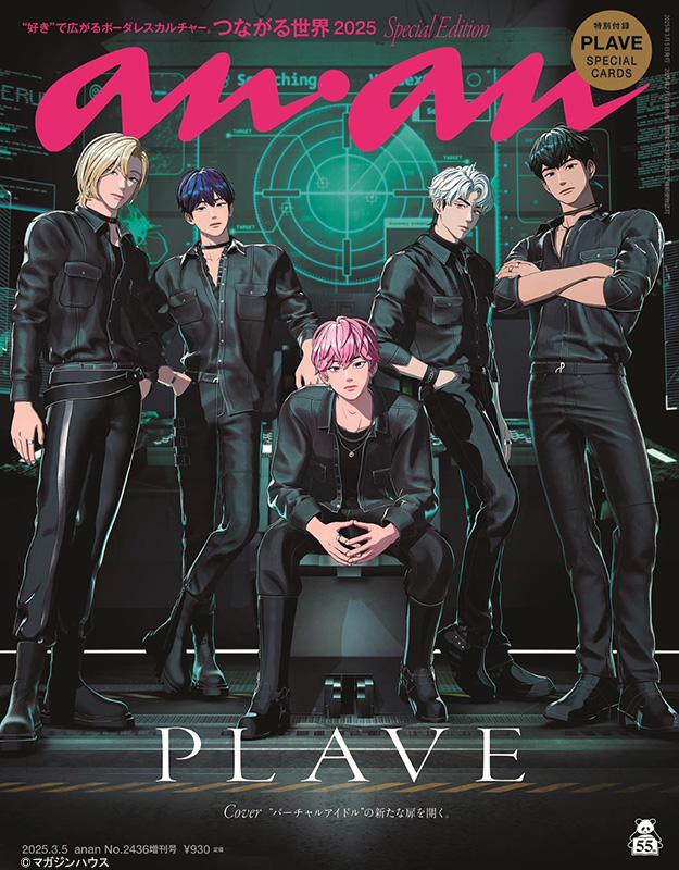 昨年、日本初撮り下ろし表紙として登場し、海外のネット書店を中心に売り切れが続出し、「anan」初の海外重版を記録。今回は表紙とバックカバーのダブルカバーで登場し、今月3日に発売されたばかりの3rd Mini Album ‘Caligo Pt.1’の座談会のほか、作詞・作曲・プロデュース、振り付けをメンバーが行う“自主制作ドル”としてのクロストーク、多くの人々を熱狂させるPLAVEのハイクオリティなバーチャル技術に迫るクリエイターインタビューや、PLAVEとファンの世界をつなぐツールとして欠かせないライブ配信についても深掘りする。バーチャルという物理的な距離がありながらも、音楽やライブ配信を通じて世界とつながり、心の距離を縮め、バーチャルアイドルとしての壁を越えていくPLAVEのクリエイティブに迫る。16枚のスペシャルカード特別付録も必見。