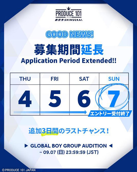 日本のエンタテインメント界で過去最大級の規模となるサバイバルオーディション番組『PRODUCE 101 JAPAN』の第4弾『PRODUCE 101 JAPAN 新世界』の参加者募集締め切りを、3日間延長することが決定しました。9月7日(日)23:59:59が最終の締め切りとなります。