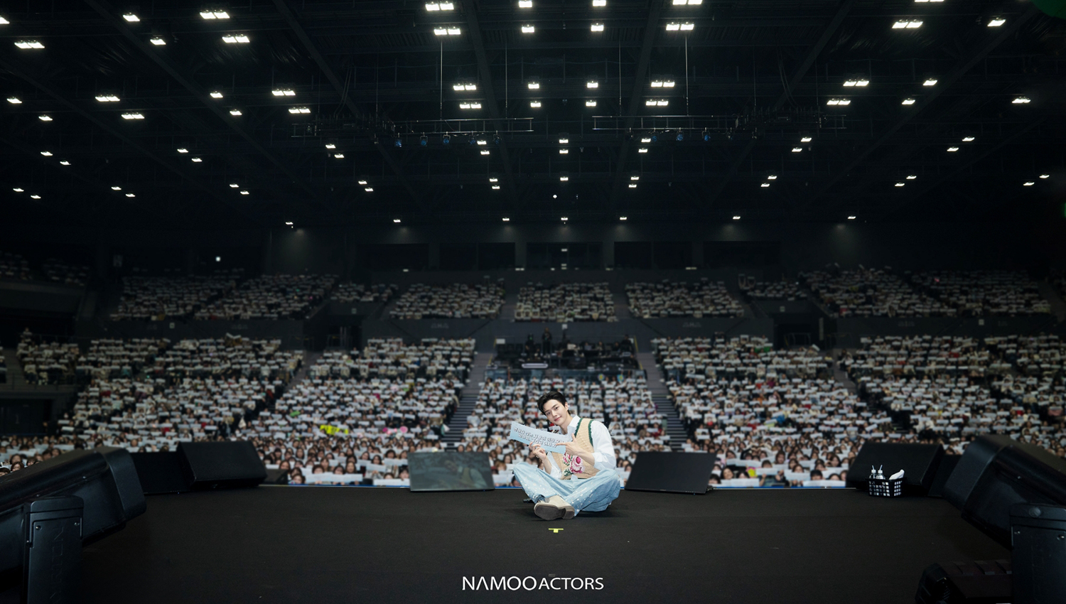 間もなくイベントも終了ということで、ここで記念撮影をすることになり、ソン・ガンがスクリーンのほうを向いたタイミングで、サプライズでソンピョンからのメッセージ映像がスタート。その温かいメッセージの数々に、目を潤ませたソン・ガン。客席のソンピョンからは“편하지 않은 사람이 이끈 오늘 고마워, 그리고 어서 와(変わらない愛が導いた今日ありがとう、そしておかえり)” のスローガンも掲げられ、さらにソン・ガンの涙を誘っていた。