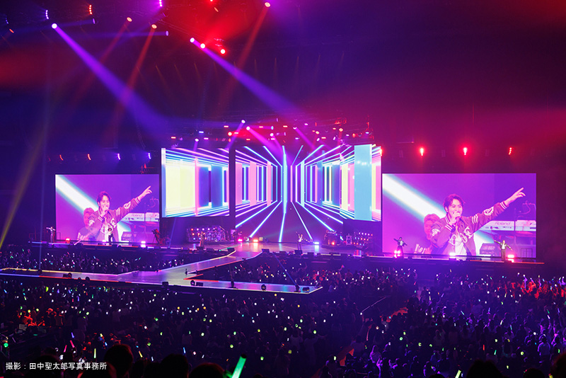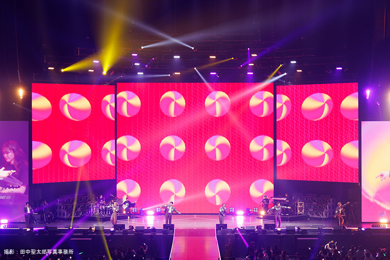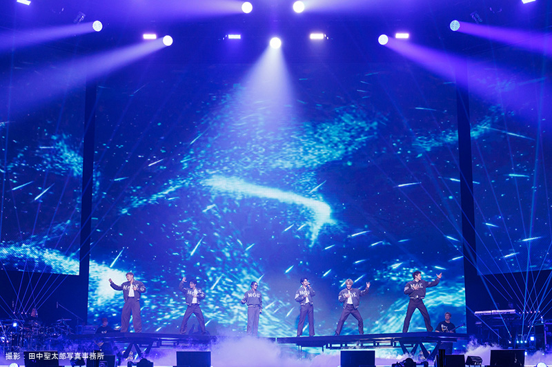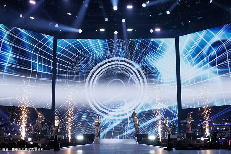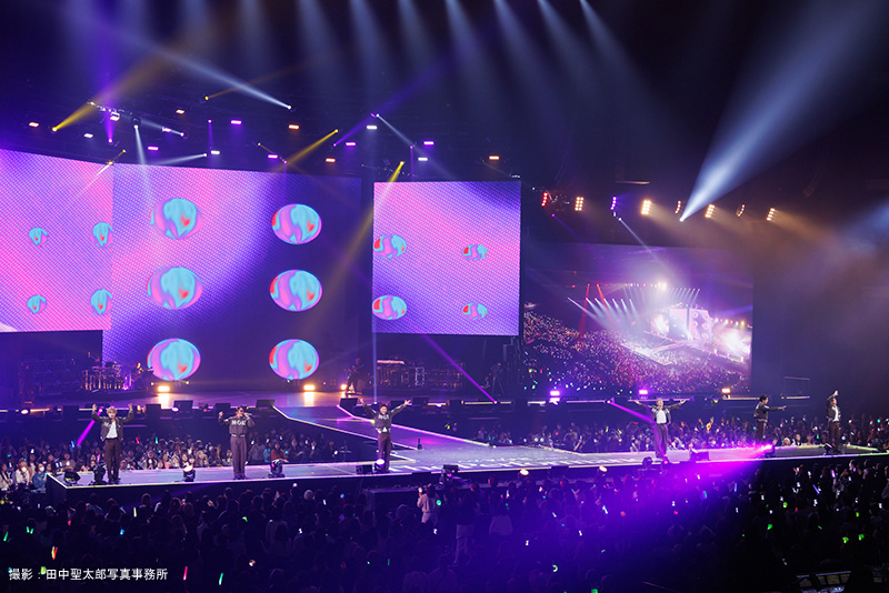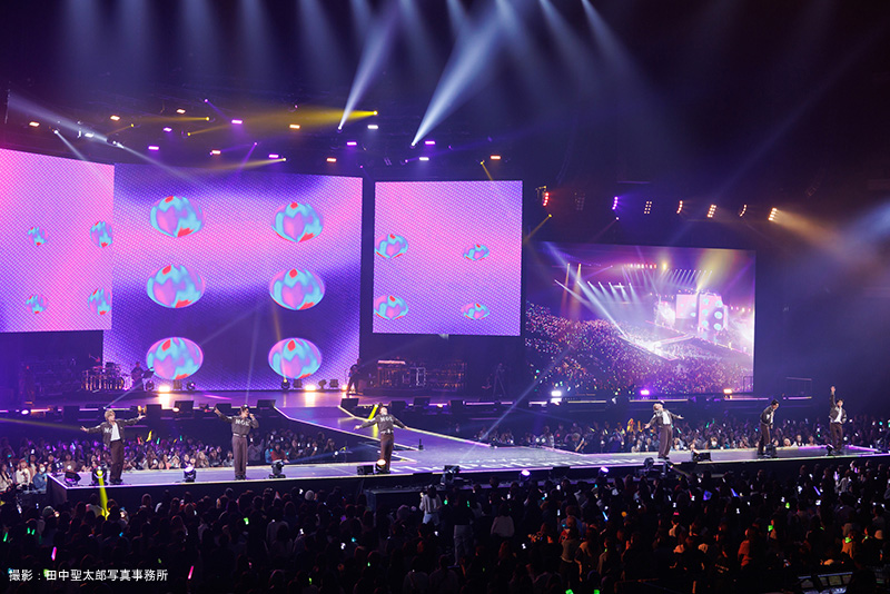 バンドを従えて4組目に登場したのはGENERATIONS。奈落からせり上がる様子も臨場感たっぷりのライブ映像で流され、そのままステージへ。炎の上がる中、『Diamonds』がスタートすると、数原龍友が「騒ごうぜ、Kアリーナ!」と会場を鼓舞し、それに応える観客たち。続いて片寄涼太の「一緒にClap your hands!」の声で『Evergreen 2.0』が始まると、メインステージがせり上がっていき、「♪もっと高く~」の歌詞のように、空高く手を伸ばす6人。そして数原の「紹介します!GENERATIONS パフォーマーズ!」の声で、白濱亜嵐、小森隼、佐野玲於、中務裕太の4人がアクロバットも交えたダンスブレイクを披露すると、6人全員で円陣を組む場面も。