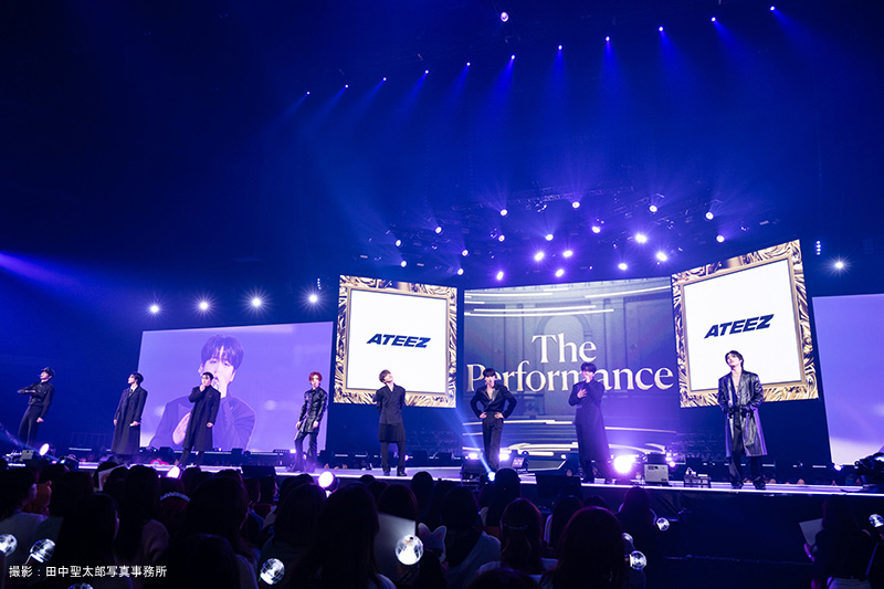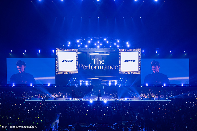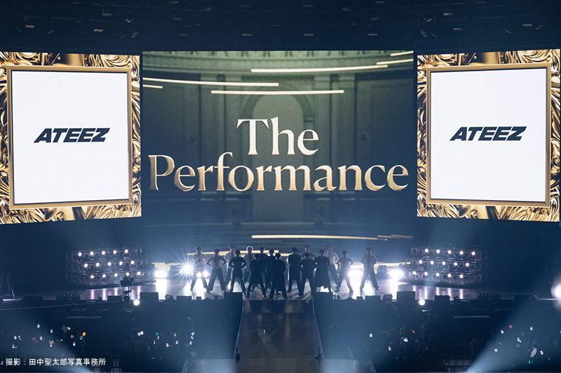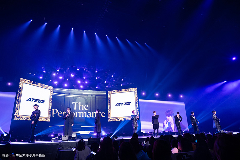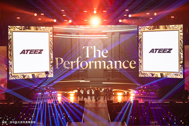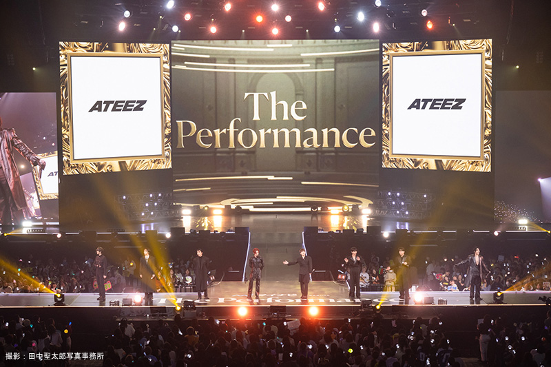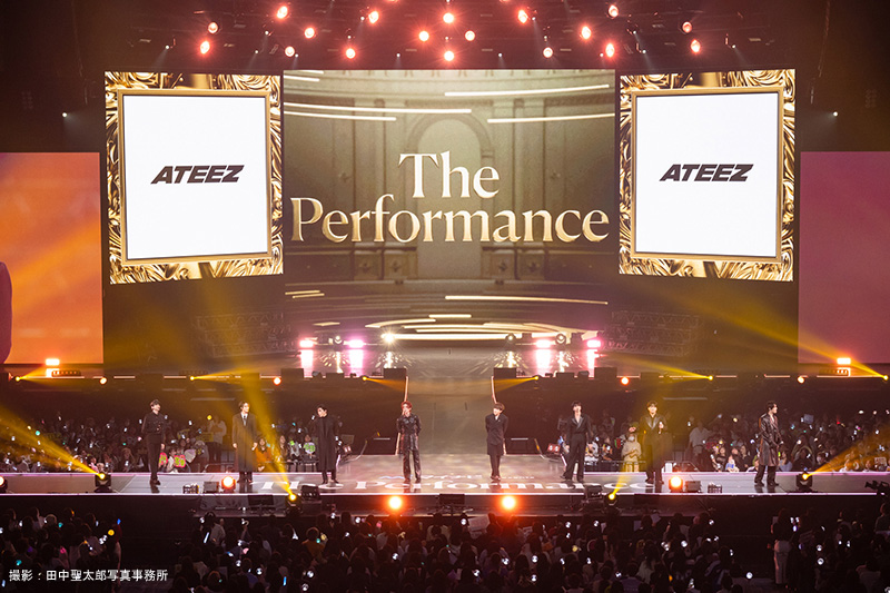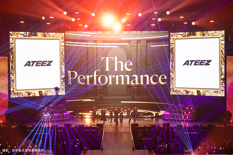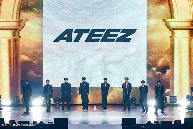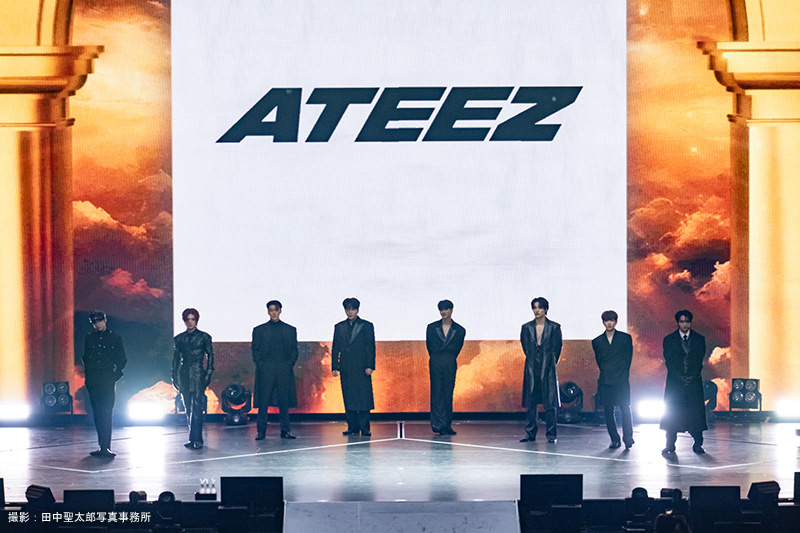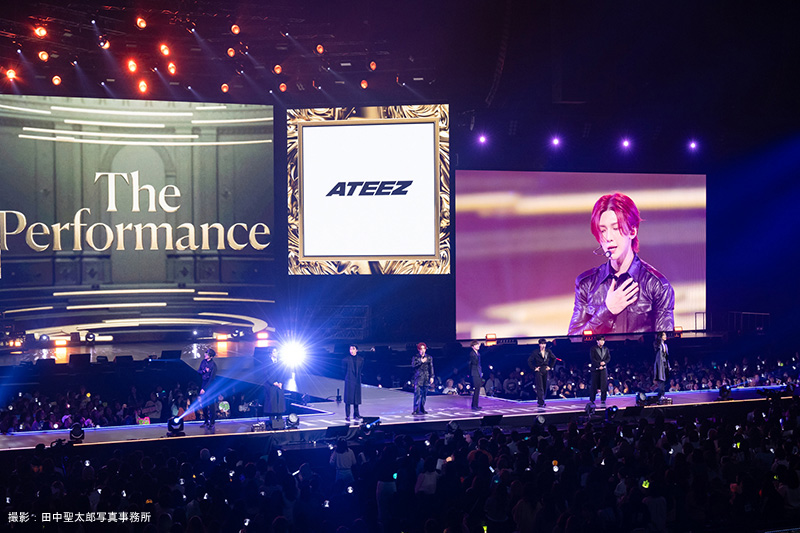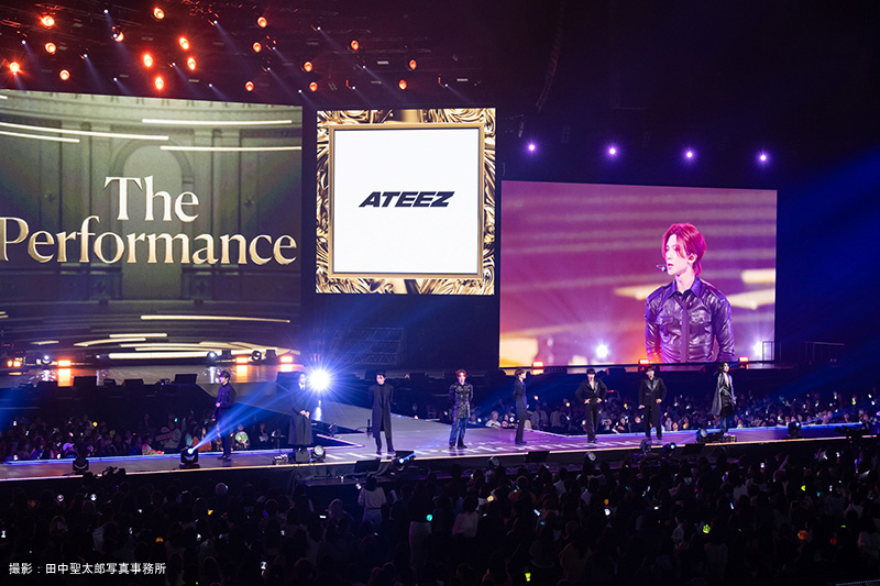 そしてユンホが「初日も2日目も、たくさんのアーティストの方々が素敵なステージを見せてくださったと聞きました。今日はATEEZが来ましたよ」と客席に声を掛けると大歓声。ソンファも「このステージに立てて、とても光栄です。ATEEZの魅力といえば、やっぱりパフォーマンスですよね、ヨサンさん」とコメントすると、フラれたヨサンは「今日はATEEZならではのパフォーマンスをみなさんにお見せします」、ウヨンも「たくさんの曲を準備したので、みなさんも一緒に楽しんでくださいね」とうれしい予告をすると、「もっと近くて一緒に盛り上がるために、前の方に行きましょうか」というミンギの言葉で手を振りながら花道を歩き、センターステージへ。