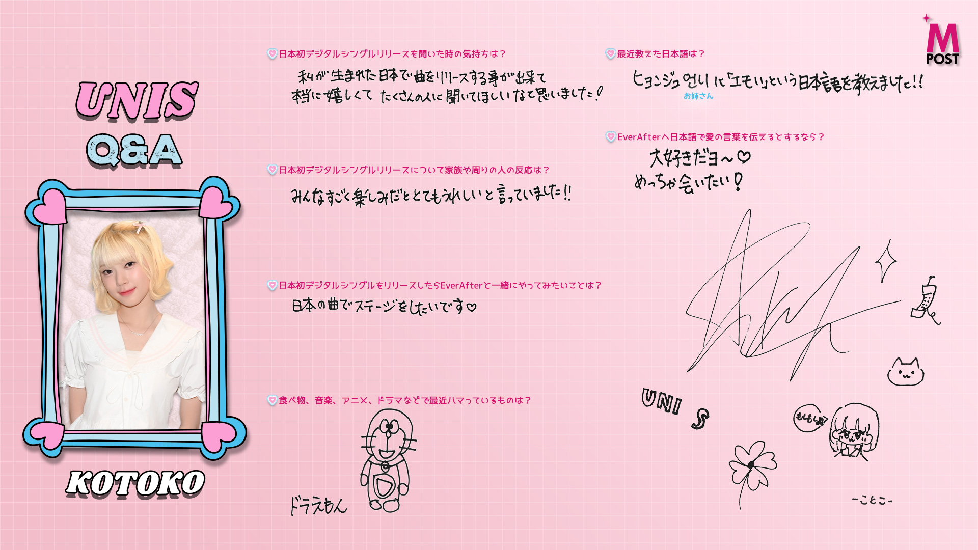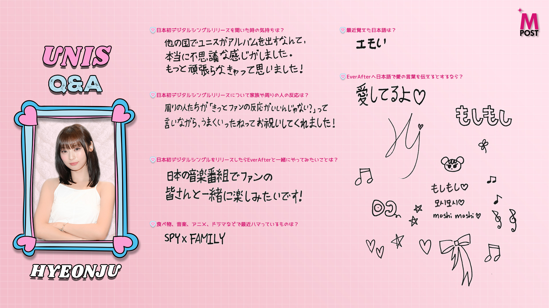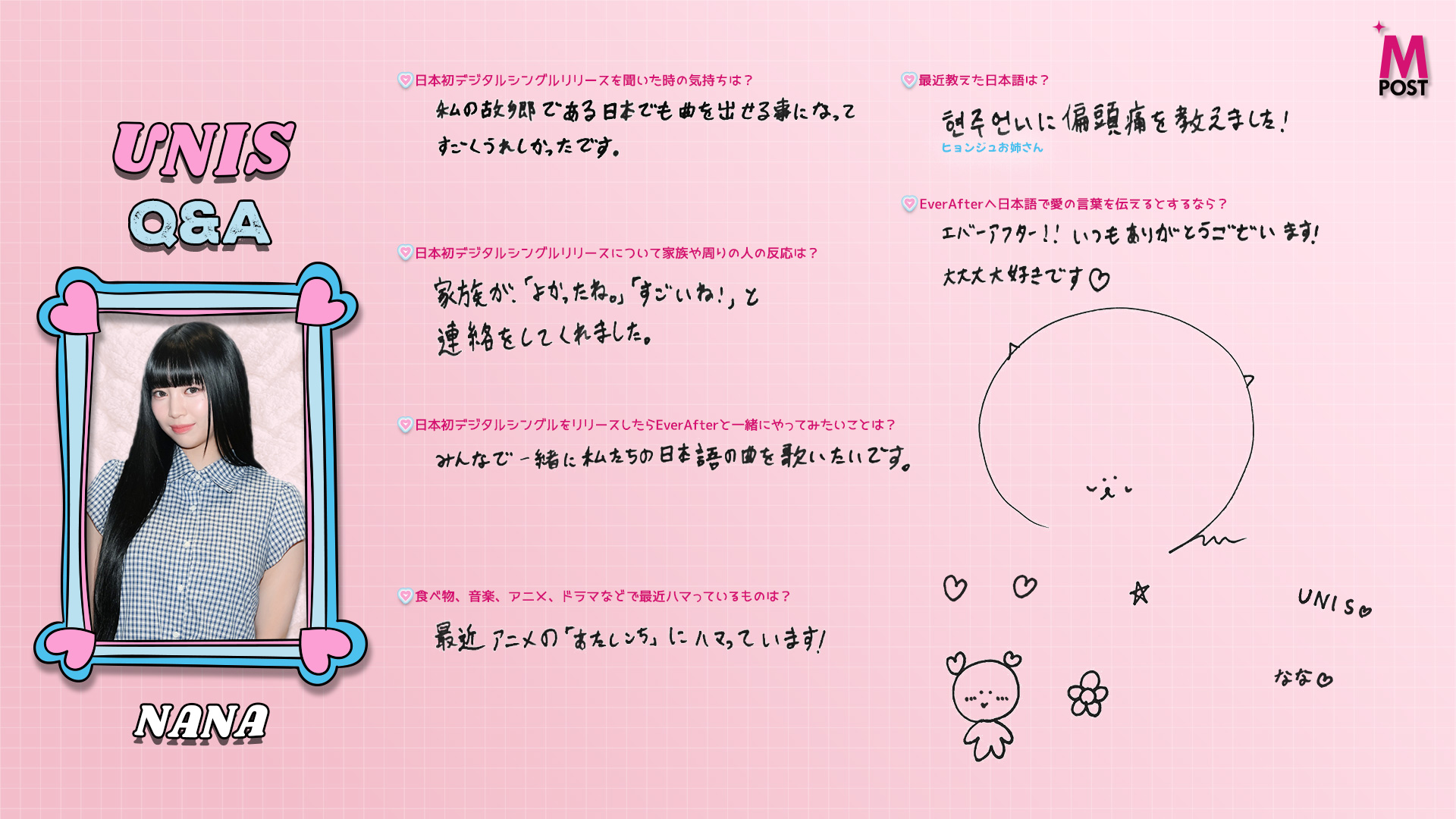 そんなUNISが満を持して、9月12日(金)に日本初のデジタルシングル『もしもし♡』をリリース!多くのファンが期待を寄せる中、8人が韓流MpostオリジナルのQ&Aに答えてくれた。